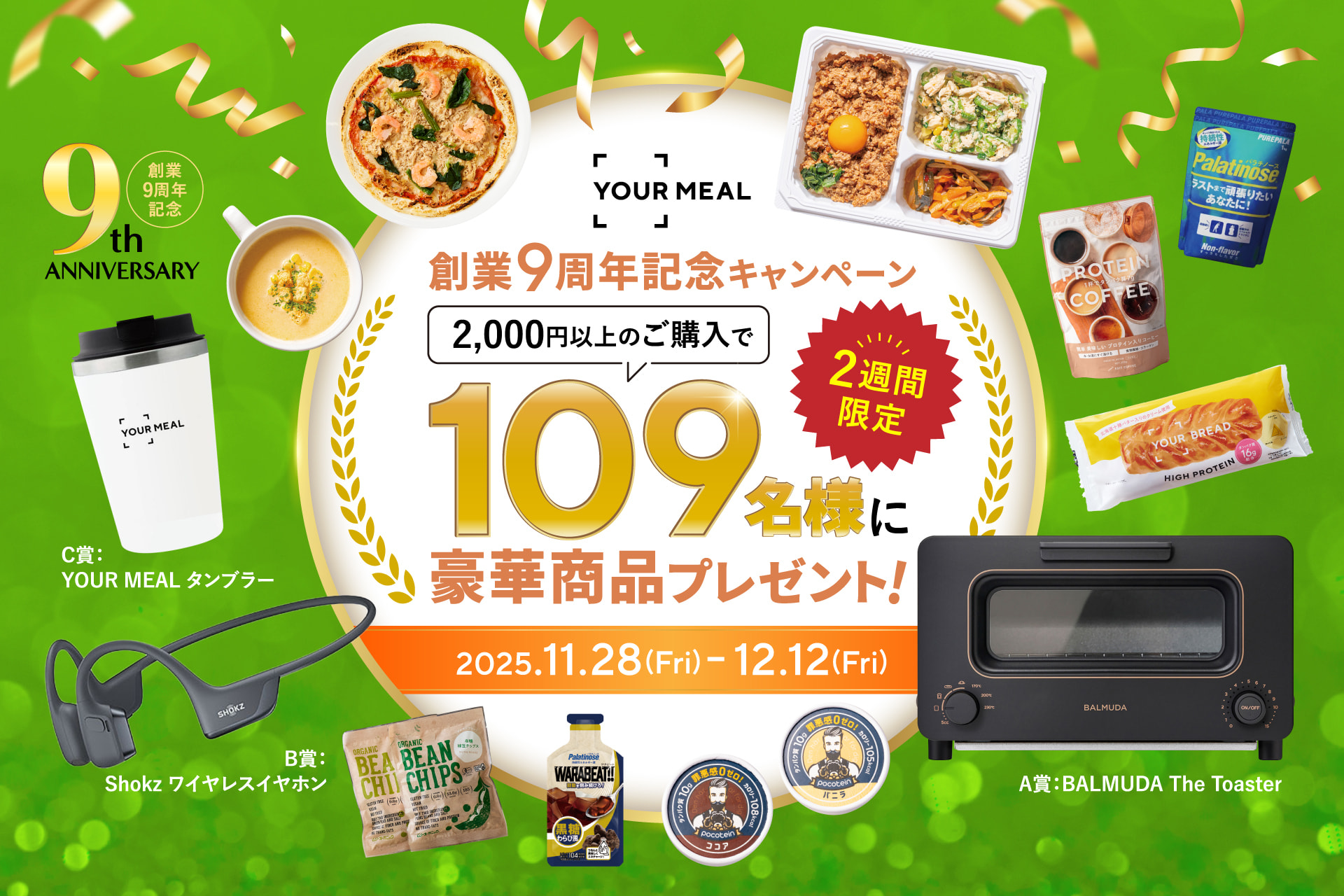 そこで、日頃の感謝の気持ちをお伝えしたく、11月28日~12月12日の間2,000円以上ご購入の方を対象に、109名に豪華景品が当たるキャンペーンを実施いたします。