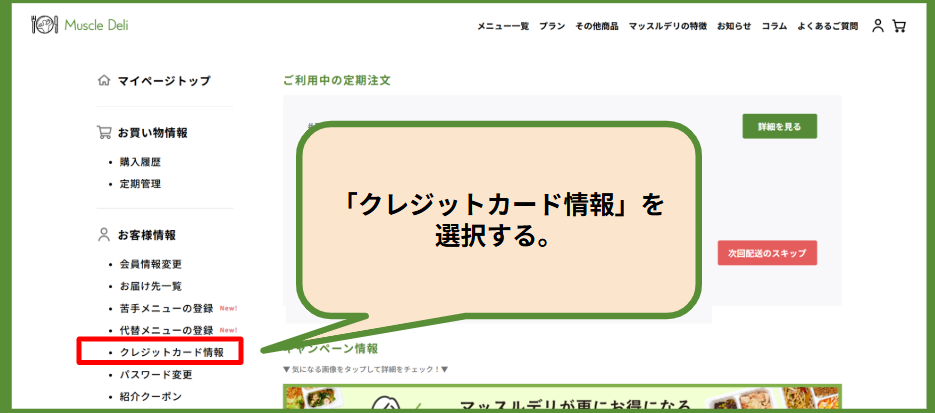 1.マイページにログインし、「クレジットカード情報」を押す。